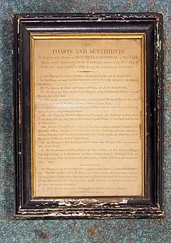 - ^ "Toasts and Sentiments to be given after dinner at Mitchell's Hospital", Framed note hung up in the hospital