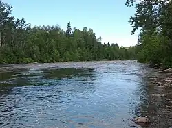 The Mitis River is between the Matane and Rimouski rivers. It gives its name to La Mitis Regional County Municipality.[3] The main tributaries are the Neigette and Mistigougèche rivers.[1] The average flow is 16 cubic metres per second (570 cu ft/s), a steady rate due to the two dams built in the first half of the 20th century.[3][b] The river can be accessed from a path that runs along its length. The river bed has fairly large rocks and red clay, but little gravel. The clay gives the clear river water a slightly reddish tinge after a heavy rainfall.[1]