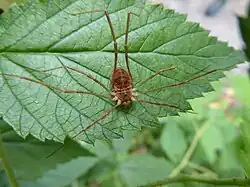 Adults can be found from the middle of May until the middle of November,[8] depending on the location. Eggs hatch at the end of March.[5] These harvestmen feed on small insects and other small arthropods.[3][5] Mitopus morio has been observed to walk using its first, third, and fourth sets of legs, using the unusually long second pair of legs to feel in front of it and probe its environment.