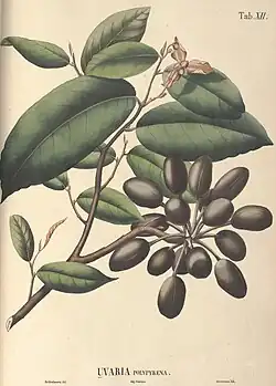 | Color illustration of Mitrephora polypyrena under basionym Uvaria polypyrene.[1] | |