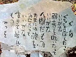 Mitsuo Aida (相田みつを, Aida Mitsuo; 20 May 1924 – 17 December 1991) was a Japanese poet and calligrapher known as The Poet of Zen.[1] His work was influenced by Zen Buddhism and he is known for his works, Ningen damono (Because I'm Human), Okagesan (Our Debt to Others), and Inochi ippai (Live a Full Live).[2]