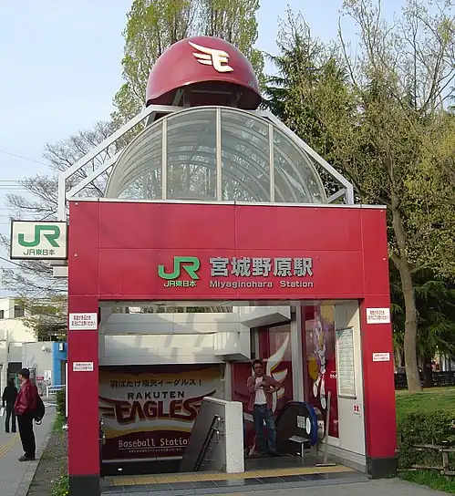Miyaginohara Station opened on January 1, 1926, as a station on the Miyagi Electric Railway. The line was nationalized on May 1, 1944. The station was absorbed into the JR East network upon the privatization of JNR on April 1, 1987. The station was relocated underground in 2000, some 150 meters to the southeast of its former location. On March 26, 2010, the station added its own departure melody, which is a part of the theme song of the Tohoku Rakuten Golden Eagles.[1]