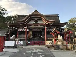The honden of the shrine and a stone torii gate were rebuilt in 1672. Both were designated Fukuoka Prefectural cultural property in 1961.[3] [4]
