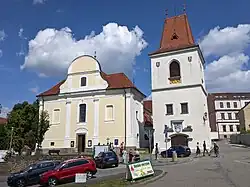 Among the main landmarks of the town is the Church of Saint Martin. Existence of the church was first documented in 1348. After it dilapidated, a new Baroque church was built in 1794. It is situated on a reinforced terrace above the Žižkovo Square.[9] Next to the church is a separate bell tower, built in 1425 and rebuilt in the pseudo-Gothic style at the beginning of the 20th century.[10] All the church bells were seized in 1942 except for the passing bell; the bell called Jan was returned and blessed as late as 1952 and three new bells, Maria, Václav and Martin sounding Gloria in concord, were bought thanks to fund-raising in 1986.[9]