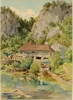 The springs are located at the end of the Močilnik Valley, a steephead valley 180 m long near Vrhnika. Big Močilnik Spring (Slovene: Veliki Močilnik) is found in a pond below the cliffs, and Little Močilnik Spring (Mali Močilnik), with a smaller flow, lies 50 m further north. They join together to form the Little Ljubljanica River (Mala Ljubljanica),[3] which joins the Big Ljubljanica River (Velika Ljubljanica) after about 1 km, forming the Ljubljanica. The water that surfaces at Močilnik Springs seeps into the ground at the Planina Karst Field and Logatec Karst Field. Not far from Močilnik Springs is Furlan Hot Springs (Furlanove toplice). It has a constant temperature of about 20 °C.[4]
