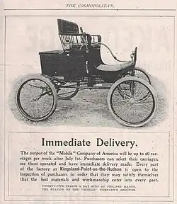 Advertising for the Mobile Company was taken out in most major magazines and as Brisben Walker was the publisher of Cosmopolitan Magazine, the Mobile Company of America featured prominently in it. Mobile's new factory was expected to produce 20 steam carriages weekly. By the fall of 1901, production was averaging 5 steam carriages a week.[4][3] Locomobile built approximately 5,000 steam runabouts over three years. Mobile, being slower to market, built an estimated 600. In early 1903, the Mobile Company of America stopped production. Later in 1903, the equipped automobile plant at Kingsland Point was leased to Maxwell-Briscoe.[2][4]
