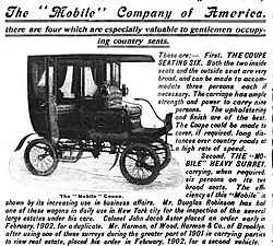 Mobile's version of the steam carriage had a 5 to 12 horsepower engine, with a water tank range of about 35 miles and a gasoline tank range of between 60 and 75 miles. In 1901 kerosene could replace gasoline for fuel. Originally built as a light runabout, Mobile added up to 24 styles of bodies to improve poor sales. By 1902, a top speed of 50 mph was claimed. Prices for the Model 4 runabout started at $750 (equivalent to $27,257 in 2024) rising to a 9-passenger "coupe" Model 50 at $3,000 (equivalent to $109,027 in 2024).[2][1]