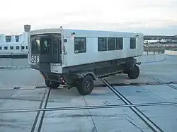 The mobile lounge was an innovative feature of the main terminal at Dulles International Airport, designed by Eero Saarinen.[1] Saarinen promoted the mobile lounge concept with a short animated film by Charles and Ray Eames.[2] Dulles Airport was the realization of the concepts expressed in the film. Dulles's designers thought that by shuttling from the main terminal directly to a midfield jet ramp, they could save passengers from long walking distances amidst weather, noise, and fumes on the ramp. The advent of the jet bridge and construction of the two midfield concourse buildings at this airport canceled out the benefits of the system.