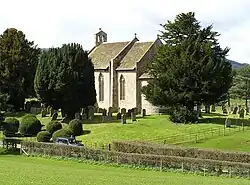 The parish is mainly farmland with a number of woods, including Woodbury Hill Wood and the Moccas Park Deer Park (though mostly in Dorstone parish). The parish church of St Michael is well known as the site of the very early Welsh Moccas Monastery, founded by Saint Dubricius in the 6th century,[2] as recorded in the Book of Llandaff.[3] The church has a notable monument to the de Fresnes family, lords of the manor in the 14th century.[4]