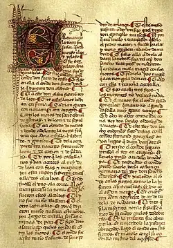 There are 1,164 surviving verses,[1] preceded by an initial prose fragment. The only codex that contains the work is a manuscript from 1400[2] that is kept in the National Library of Paris.[3] The text that has reached us lacks a title, and critics have variously titled the work Mocedades de Rodrigo or del Cid ("The youthful deeds of Rodrigo, the Cid"), Refundición de las Mocedades de Rodrigo ("A Recasting of the Youthful Deeds of Rodrigo"), Cantar de Rodrigo y el Rey Fernando ("Song of Rodrigo and King Fernando") and Crónica rimada del Cid ("The Rhyming Chronicle of El Cid").[4]
