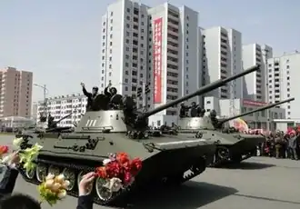 The Model 1981 "Shin'heung"[1] (Rise), in western countries known as the PT-85, is a North Korean amphibious light tank. It is built for the needs of their army, with around 500 examples operated.[2] The Model 1981 "Shin'heung is based on the lengthened VTT-323 APC chassis, and although the turret appears similar to PT-76, the PT-85 has a higher horseshoe-shaped turret, with an 85 mm gun and hatches similar to those of a T-54.[2] The US Department of Defence calls it the M-1985.[3]