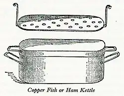 The book was from the first edition onwards illustrated with a large number of small woodcuts. Some show cookware, like the pot used to serve Bouillon or the "Mackerel Kettle", a deep oval saucepan with a lid, used to cook fish; some illustrate produce as the housekeeper would see it in the market, like the engravings of poultry and fish—educating the reader in the recognition of gurnard, sea bream, plaice, grey mullet, garfish, and sand-eel; others show finished dishes, like the Lady's Tourte or a moulded jelly, "tastefully garnished with preserved, or with fresh fruit."[11]
