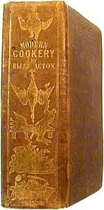 Modern Cookery for Private Families is an English cookery book by Eliza Acton. It was first published by Longmans in 1845, and was a best-seller, running through 13 editions by 1853, though its sales were later overtaken by Mrs Beeton. On the strength of the book, Delia Smith called Acton "the best writer of recipes in the English language",[1] while Elizabeth David wondered why "this peerless writer" had been eclipsed by such inferior and inexperienced imitators.[2]