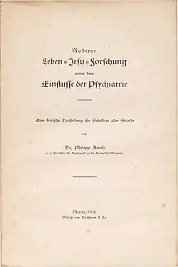 Moderne Leben-Jesu-Forschung unter dem Einflusse der Psychiatrie (English: Modern Quest for the historical Jesus Under the Influence of Psychiatry) is a book published in 1908 by Philipp Kneib. In the years before the publication, several authors had brought up the notion that Jesus was not divine, but rather an influential mentally ill individual. Kneib tries to reject this idea in his book by discussing the general possibility of miracles and the resurrection of Jesus. He further deals with every argument for the notion that Jesus was mentally ill and brings up counterarguments. By upholding the believe that Jesus was sane, Kneib tries to reinforce the belief in Jesus' divinity.[1]