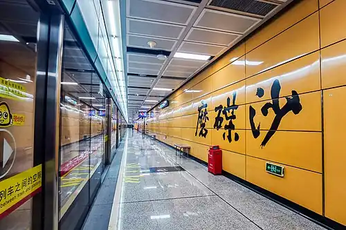 Modiesha station (Chinese: 磨碟沙站; pinyin: Módiéshā Zhàn; Jyutping: mo4dip6saa1 zaam6) is an interchange station between Line 8 and Line 18 of the Guangzhou Metro. Line 8 started operation on 28 June 2003 and Line 18 started operation on 28 September 2021.[1] It is located under Xingang East Road (新港东路) in the Haizhu District of Guangzhou.[2]