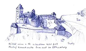 The name of the town was first mentioned as Keykkw in 1290. The name of the settlement means "Blue Rock". Ruins of the castle Modrý Kameň stand on a rock pinnacle above the town. The castle was built in the second half of the 13th century by the ancestors of the Balassa noble family. They had to recapture the castle from the sons of Casimir of the Hont-Pázmány clan by a siege in 1290. The castle was captured by Ottoman troops in 1576, because its guard fled when they heard the approaching Ottomans. The castle was given up and subsequently destroyed by Ottoman troops in 1593. It was restored between 1609 and 1612 by Sigismund Balassa. The castle was ravaged many times during the 17th century, so it became ruined and abandoned. The Balassa family built a new Baroque mansion house on the side of the castle hill in the early 18th century; stones of the former castle were used in the mansion building operations. The last member of the Balassa noble family died in 1899. After the demise of the Balassa family, the Almásy noble family became the proprietors of Modrý Kameň castle. They sold the demesne to the Czechoslovak state in 1923.