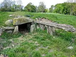 The Prehistoric Trail leads visitors through the baroque-styled Manor Park, laid out around the same time Moesgaard Manor was constructed (in the 1770s) down to the field shown on maps as "Jens Michelsens toft". Here are several stone burial chambers from various parts of Denmark illustrating how traditions of burial changed over time during the Stone and Bronze Ages. These were relocated here and carefully reconstructed when their original sites were lost to development. The field is grazed by Gotland sheep in the summer to keep the vegetation around the burial chambers down.[15][16]