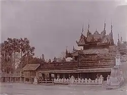 Mogaung Monastery (Burmese: မိုးကောင်းကျောင်း) is a Buddhist monastery in Mandalay, Myanmar (Burma). The wooden monastery was built by the Mogaung Mibaya, a minor queen of King Pagan Min in 1847.[1] The monastery's dimensions are 258 by 106 feet (79 m × 32 m) and is supported by 342 teak pillars.[1] The monastery's wooden carvings are adorned with motifs from the Ramayana.[1]