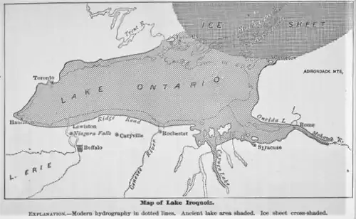 During the Pleistocene (c. 1.8 to 0.01 mya), the watershed was extensively modified by continental glaciation. As a result of glacial scour and deposition, the surficial deposits in much of the watershed are poorly sorted boulder- and clay-rich glacial till. During deglaciation, several glacial lakes left varved clay deposits. In the final stages of deglaciation, approximately 13,350 years ago,[19] the catastrophic draining of Glacial Lake Iroquois, a pro-glacial lake, was through what would become the modern Mohawk Valley.[20] In this final phase, the enormous discharge of water caused local deep scour features (e.g. the Potholes at Little Falls), and extensive sand and gravel deposition, which is one of the key sources of municipal groundwater including the Scotia Delta, which is also known as the Great Flats Aquifer.[21]