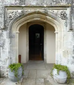 - Sir William Carew (d.1501)[43] of Bury St Edmunds in Suffolk, created a knight banneret by King Henry VII, after the Battle of Blackheath (1496). He received from his mother the estates of "Wicheband", "Widebridge", Bokeland (Buckland-in-the-Moor) and "Bledeuagh". His tomb[44] survives on the north side of the chancel[45] of St. Mary's Church, Bury St. Edmunds, with recumbent effigies of himself and his second wife Margaret Chedworth (d.1525), a niece of John Chadworth (d.1471), Bishop of Lincoln,[46] and is near that of Princess Mary Tudor (1496–1533), younger sister of King Henry VIII, wife of King Louis XII of France and secondly of Charles Brandon, 1st Duke of Suffolk (d.1545).[47] His great-grandson Thomas Carew (1639-1604) married the heiress of Crowcombe in Somerset, and founded a branch of the Carew family there, which in the early 19th century recovered possession of the family's most ancient seat of Carew Castle in Pembrokeshire, and was still surviving in the late 19th century.[48] The surviving Palladian mansion of Crowcombe Court was built by Thomas Carew (1702–1766),[48] circa 1724–39 and was described by Nikolaus Pevsner as "the finest house of its date in Somerset south of the Bath area".[49][50]
