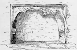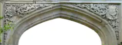 The arms of Mohun (ancient) survive at Mohuns Ottery: "There, on a shield in the spandrel, is carved, amid elegant scroll work and foliage, the old coat-armour of the family — an arm vested in an ermine maunch, the hand grasping a golden fleur-de-lys; a bearing, which, for some reason unknown, John de Mohun, Baron of Dunster, who died in 1330, abandoned for the afterward well-known coat, adopted also by the Abbeys of Newenham and Bruton — a cross engrailed sable, on a field or".[26]
