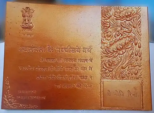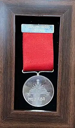 For his contribution to the Indian Independence Movement, Moji Riba was included among the first batch of Tamra Patra recipients. He was given this prestigious award at Red Fort, New Delhi, by Prime Minister Indira Gandhi and President V. V. Giri on 15 August 1972.[20][21] On 23 September 2021, postal department of Arunachal Pradesh released a stamp in honor of late Moji Riba.[22] In 2023, he was also awarded posthumously the state silver medal for Unsung Hero award by the state's Governor Kaiwalya Trivikram Parnaik.[23]