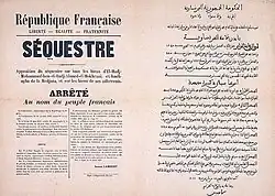 After the end of the hostilities of the insurrection of Cheikh Mokrani, the Algerian rebel leaders who were captured alive appeared before the Assize Court of Algiers on December 27, 1872, on a count of indictment and an act of accusation linked to the sacking of the French colonies, the assassinations, fires and looting which sparked heated debates on this extremely important affair.[28]