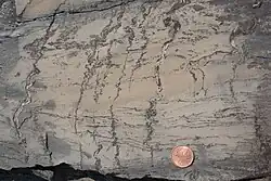 Molar tooth structures are millimeter- to centimeter-scale microcrystalline ribbons and 'blobs' of calcite within argillaceous carbonate sedimentary rocks, sometimes reaching tens of centimeters in size.[2] The ribbons can be oriented both vertically and horizontally. The sediment matrix that molar tooth structures occur in is generally composed of finely crystalline calcite and dolomite, and fine-grained detrital quartz, feldspar, and clay minerals.[2][1] The depositional environments that molar tooth structures are found in span from deep waters near storm wave base, to shallow intertidal.[8][6]