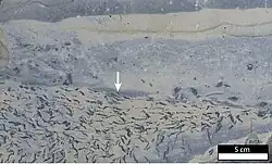 Molar tooth structures are ribbon-like veins and nodules of calcite that are found widespread in Precambrian carbonate sedimentary rocks between approximately 2600 to 570 million years ago.[1] Their mechanism for formation remains debated, with hypothesis including the generation of methane gas within sediments,[2][3] pumping of water through sediment by wave action,[1][4] tsunamis,[5] and bacterial processes.[6]