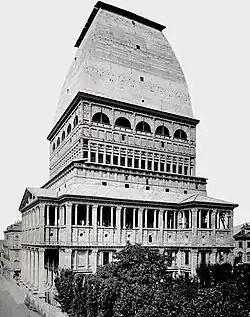 On 23 May 1953, a violent cloudburst, accompanied by a tornado, destroyed the uppermost 47 m (154 ft) of the pinnacle, which was rebuilt in 1961 as a metal structure faced with stone. Guido Chiarelli carried out the project for the lighting of the pinnacle, at the end of the reconstruction work.