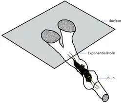 Male mole crickets sing by stridulating, always under ground.[14] In Gryllotalpa gryllotalpa, the song is based on an almost pure tone at 3.5 kHz, loud enough to make the ground vibrate 20 cm all round the burrow; in fact, the song is unique in each species. In G. gryllotalpa, the burrow is somewhat roughly sculpted; in G. vineae, the burrow is smooth and carefully shaped, with no irregularities larger than 1 mm. In both species, the burrow has two openings at the soil surface; at the other end is a constriction, then a resonating bulb, and then an escape tunnel. A burrow is used for at least a week. The male positions himself head down with his head in the bulb, and his tail is near the fork in the tunnel.[14][16]