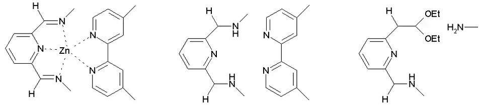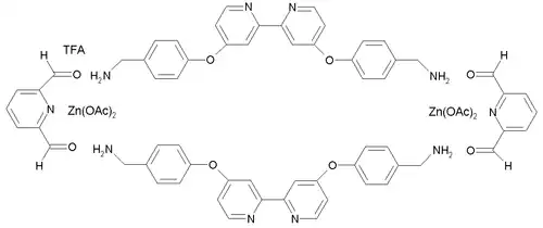 The synthesis of the macrocyclic systems involves self-assembles of two organic building blocks: 2,6-diformylpyridine (an aromatic compound with two aldehyde groups positioned ortho to the nitrogen atom of the pyridine ring) and a symmetric diamine containing a meta-substituted 2,2'-bipyridine group. Zinc acetate is added as the template for the reaction, resulting in one zinc cation in each of the six pentacoordinate complexation sites. Trifluoroacetic acid (TFA) is added to catalyse the imine bond-forming reactions.[1] The preparation of the tri-ring Borromeate involves a total of 18 precursor molecules and is only possible because the building blocks self-assemble through 12 aromatic pi-pi interactions and 30 zinc to nitrogen dative bonds. Because of these interactions, the Borromeate is thermodynamically the most stable reaction product out of potentially many others. As a consequence of all the reactions taking place being equilibria, the Borromeate is the predominant reaction product.[1]