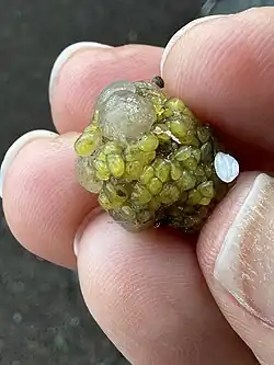 They are translucent with two protruding siphons, oral and atrial consisting of six and four lobes respectively.[3] They are found subtidally, attached to slow-moving submerged objects or organisms. All species of Molgula have a fluid-filled structure called the renal sac.[5] The renal sac contains nitrogenous wastes, solid concretions composed of weddellite and calcite,[6] and an apicomplexan symbiont called Nephromyces.[7] To further expand on the animals structures, they contain a layer of tunic and given the slight variations existing within the species in terms of forms, they have evolved different bodily and structure colorations as well.[3] For instance in the organisms classified as Molgula manhattensis, the majority have adopted shades in between light yellow and green as depicted by the colored images on the right, with a few being a dusty brown color as well. However, when comparing different species, contrast in colors can be observed.