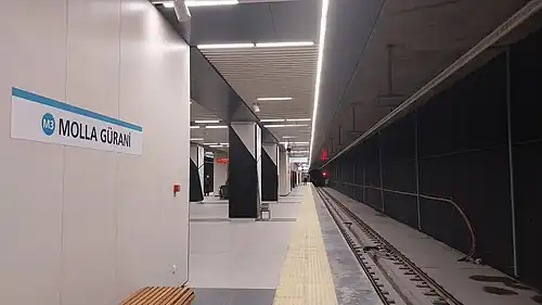 Molla Gürani is an underground station on the M3 line of the Istanbul Metro.[1][2] It is located under Mehmet Akif Boulevard in the İnönü neighbourhood of Bağcılar. It was opened on 10 March 2024, with the opening of the M3 extension from Kirazlı to Bakırköy Sahil.