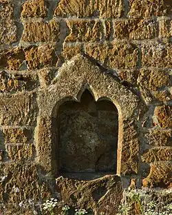 The earliest parts of the Church of England parish church of All Saints date from the 14th century, but the font is 13th century so there may have been an earlier church building on the site.[3][4] All Saints' has a north aisle which is linked to the nave by an arcade of four bays. The tower was built in the 16th century. There was a chapel on the north side of the chancel, but it was demolished in 1786. A blocked arch and doorway survive in the north wall of the chancel and a piscina can be seen from the outside.[5]