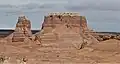 Mollys Castle is a geological feature set within the San Rafael Desert on the southeastern edge of the San Rafael Swell. This erosional remnant is composed of Jurassic rock. The thin, light-colored layer on top is Curtis Formation caprock, overlaying darker, reddish Entrada Sandstone, which is also the composition of the hoodoos that give Goblin Valley its name.[4][5]