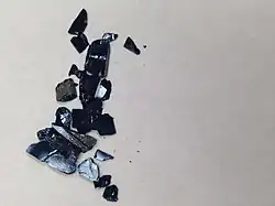 Crystals of K0.28MoO3, also called "potassium-molybdenum blue bronze".