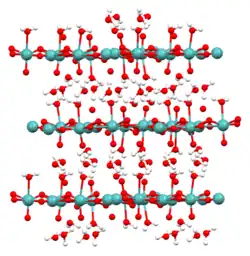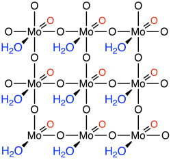 Solid forms of molybdic acid are coordination polymers. The monohydrate MoO3·H2O consists of layers of octahedrally coordinated MoO5·(H2O) units where 4 vertices are shared.[3] The dihydrate (image shown above) has the same layer structure with the "extra" H2O molecule intercalated between the layers.[4]