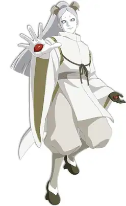 Momoshiki Otsutsuki is one of the two antagonists of Boruto: Naruto the Movie and a member of the main family of the Ōtsutsuki clan. A pale, androgynous man, he is a member of the Ōtsutsuki clan who was the reason Kaguya created the White Zetsu Army for, who comes to Earth to plant a new Shinju as the one he used is dying from using up its world's resources. Momoshiki possesses both a pair of Byakugan and Rinnegan, the latter located on his palms, which he uses to absorb and release ninjutsu. Targeting the Tailed Beasts for their chakra, attacking Killer Bee prior, Momoshiki and his partner Kinshiki come to Konohagakure with the objective of capturing Kurama from Naruto. The two manage to abduct Naruto to their dimension after destroying the Chunin Exams stadium, but before they could finish the extraction process, the pair are confronted by Boruto, Sasuke, and the four Kage. Overwhelmed, Momoshiki consumes a makeshift red pill from Kinshiki's body, making him even stronger with another Rinnegan appearing on his forehead. However, he is ultimately killed by Naruto and Boruto's combined Rasengan.[12]