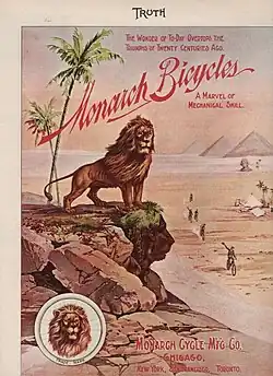 The company was founded in 1892 by John William Kiser.[1] In 1892, the year the company began, there were 35 employees and the company made 150 bicycles. By 1896 there were 1200 Monarch cycle employees, and they were producing 50,000 bicycles. The company sold bicycles worldwide.[2]