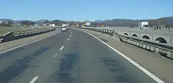 In 1958 Federal government agreed rename the Cooma-Canberra Road within the ACT as Monaro Highway: this gave the roadway a single name between Canberra and the Victorian border.[14][39] Originally, the highway ended where it met Jerrabomberra Avenue.[40][41] Plans were publicised during the mid-1980s for an upgrade of the existing Monaro Highway to dual-carriageway standard between Isabella Drive and Jerrabomberra Avenue, and an extension of the roadway to the north. These works were known as the Eastern Parkway.[42][43] These plans were then given the go ahead in a report tabled on 5 May 1987, the estimated costs were $50 million including upgrades to other nearby roadways.[44] Around the same time period a large service centre was proposed for near the Isabella Drive intersection, though it was quite controversial, and the developer pulled out.[45][46][47] Between 1988 and November 1989 the duplication was completed, and the roadway extended as far as Canberra Avenue.[48][49][50] After this the road was extended to its current terminus at Morshead Drive, although the northbound carriageway was originally routed over Dairy Flat Road until a southbound carriageway was constructed later on.[51] Further duplication was performed to other sections of the extension until all sections were completed in mid-2012.[52] The northern end of Monaro Highway now connects to the southern end of Majura Parkway following the latter's completion in 2016.[53][54] Territory and Municipal Services has classified Monaro Highway as an arterial road within the ACT Road Hierarchy.[55]