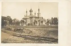 In 1903, a branch of the Monastery of St. Anthony in Radecznica was founded in Turkowice. Its superior was Sister Magdalena (Gorczakowa), who organized the new community according to the model known to her from Leśna Podlaska. The nuns operated a pharmacy, hospital, beekeeping, farming school and orphanage, and from 1910 also a teacher training seminary.[10] The monastery's leadership positions were held by Russians, but it is not possible to determine the overall number of them in the entire community.[11] The monastery complex was built from scratch. At the time of the nuns' arrival, only a wooden church was operating on the site. For the monastery, a five-domed cathedral and a complex of six residential and utility buildings (five wooden, one brick with the Church of St. Sergius and Herman of Valaam)[12] (according to another source – St. Euphrosyne of Polotsk)[13] were built. The main church in the building complex was wooden. The largest of its onion-shaped domes was situated above the nave of the structure, while the remaining lower and longer ones were located on steep tent roofs above the vestibule, chancel, and side chapels.[14] The construction project was co-financed by the Most Holy Synod.[12] Inside the main church was a three-row gilded iconostasis made in the workshop of the Monastery of St. Anthony in Radecznica. The remaining icons complementing the church's furnishings also came from there.[12] The monastic community had its own cemetery.[15] All buildings were maintained in the Russian Revival style.[14]