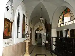 The Monastery of Saint George of Choziba (Arabic: دير القديس جورج, Greek: Μονή Αγίου Γεωργίου του Χοζεβίτου, lit. Monastery of Saint George the Hozevite), also known as Monastery of Choziba (or Hoziba) or Mar Jaris,[1] is a monastery located in Wadi Qelt in Area C of the eastern West Bank, in the Jericho Governorate of the Palestinian Authority. The cliff-hanging complex, which emerged from a lavra established in the 420s and reorganised as a monastery around AD 500,[1] with its ancient chapel and irrigated gardens, is active and inhabited by Greek Orthodox monks. It houses the relics of Saint George of Choziba, after whom the monastery is named, as well as the relics of Saint John of Choziba[2] (420/450–520/530) and those of Saint John of Choziba the Romanian (1913–1960).