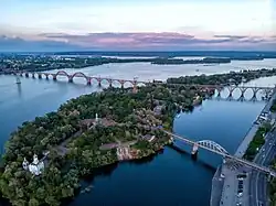 - ^ a b c d e Dmytro Yavornytskyi National Historical Museum. "Monastyrsky (Komsomolsky) island. Historical background" (in Ukrainian). Archived from the original on 18 April 2023.