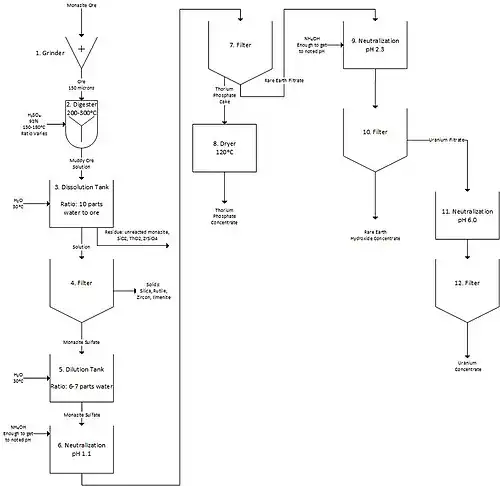 The extraction of rare-earth metals from monazite ore begins with digestion with sulfuric acid followed by aqueous extraction. The process requires many neutralizations and filtrations.[14][15]