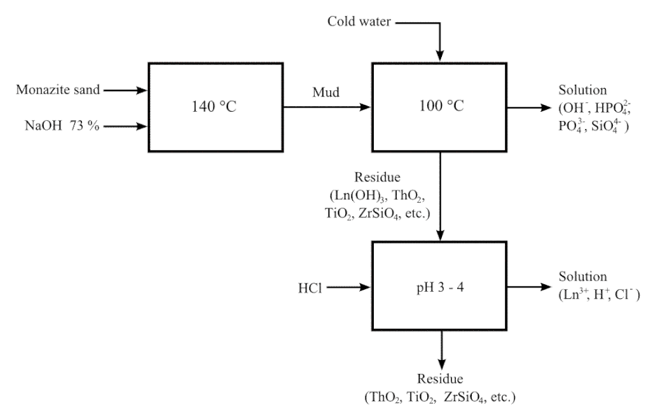 A more recent process uses hot sodium hydroxide solution (73%) at about 140 °C (280 °F). This process allows the valuable phosphate content of the ore to be recovered as crystalline trisodium phosphate. The lanthanide/thorium hydroxide mixture can be treated with hydrochloric acid to provide a solution of lanthanide chlorides, and an insoluble sludge of the less-basic thorium hydroxide.