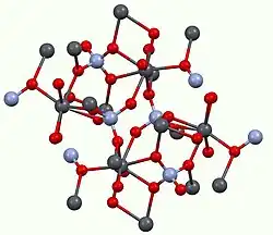 All monazites adopt the same structure, meaning that the connectivity of the atoms is very similar to other compounds of the type M(III)PO4. The M(III) centers have a distorted coordination sphere being surrounded by eight oxides with M–O distances around 2.6 Å in length. The phosphate anion is tetrahedral, as usual. The same structural motif is observed for lead chromate (PbCrO4).[12] Monazite also shares many structural similarities with; zircon, xenotime, scheelite, anhydrite, barite, and rhabdophane.[13]