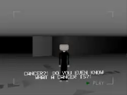 After the completion of each level, a short cutscene is shown which depicts a recording of a man loudly ranting,[5][6] with his incomprehensible speech subtitled in ungrammatical English.[8] Throughout his strange rants, the man tells how he has lost his father to cancer,[9] which has driven him to devote his life to find a cure to the disease,[10] only to finally realize that the only way to cure cancer is to "shoot it".[11] In the game's final level, the protagonist finds himself in a room with the man previously seen in the cutscenes, who exclaims "I will cure you, cancer!" before shooting the protagonist.[12]