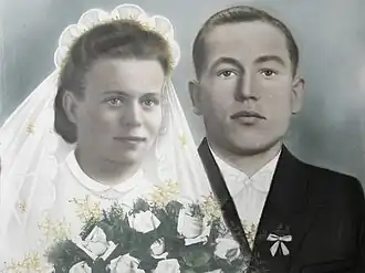 Monidło is the Polish word for a wedding portrait based on a hand-coloured photograph of the bride and bridegroom.