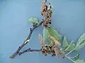 In a study conducted over a period of four years by Holb and Scherm (2007), it was reasonably concluded that the use of integrated management along with inorganic insecticides attributed a lower infection rate (6.4%) than plots using just organic insecticides (20.1%).[7] With Monilinia fructigena, it is important to note that primary infection of the pathogen occurs through wounds; vector control may be a more logical route of attempting to control the fungus.[8] It was also found that certain fungicides, namely pyraclostrobin and boscalid, applied after spring bloom were effective against Monilinia fructigena as a means of combating primary infection.[9] Conidia produced by Monilinia fructigena are also spread by the wind in times of high temperatures and low relative humidity; conidia can also be spread by rain drops. When spores are spread by rain dislodging the conidia, the added water also provides a supply of moisture for germination and mycelial development.[10]
